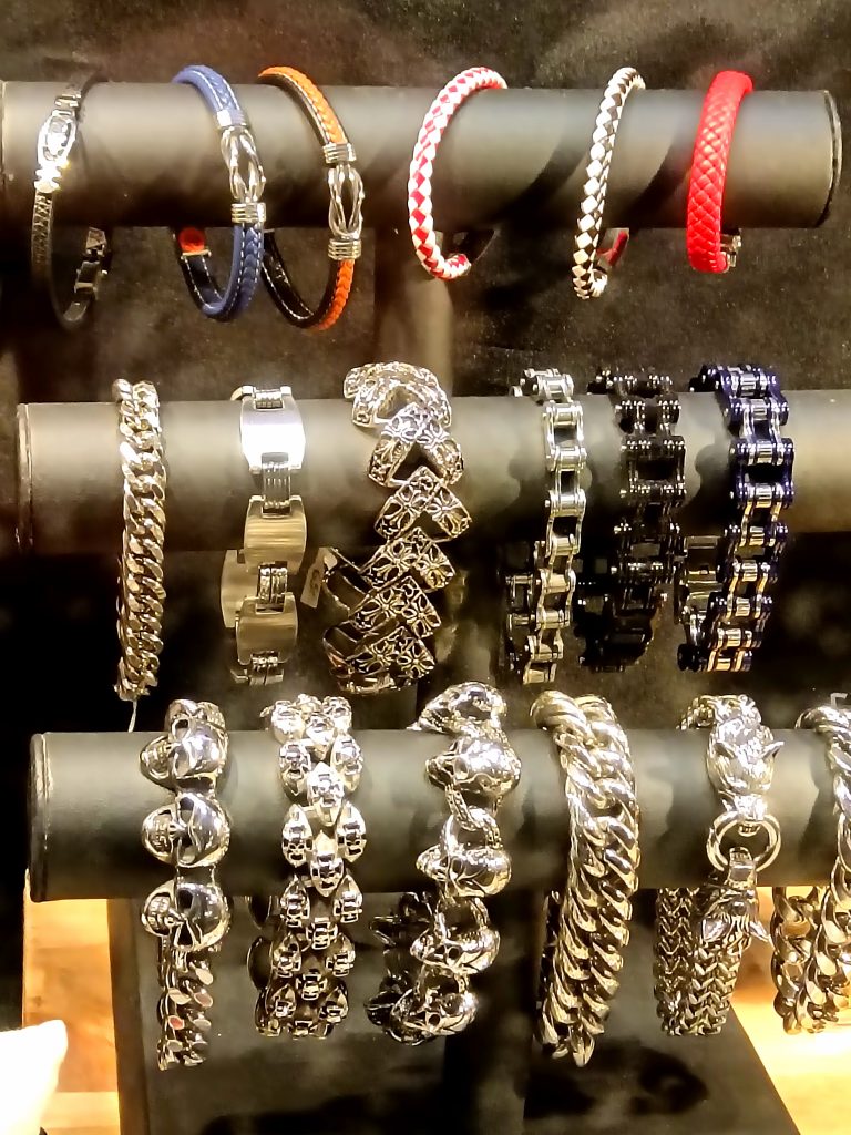 Venez passer à votre poignet nos bracelets en acier polis à la main…Chaînes de moto, dragons, têtes de mort, scorpion, tigre…De véritables oeuvres d’art !